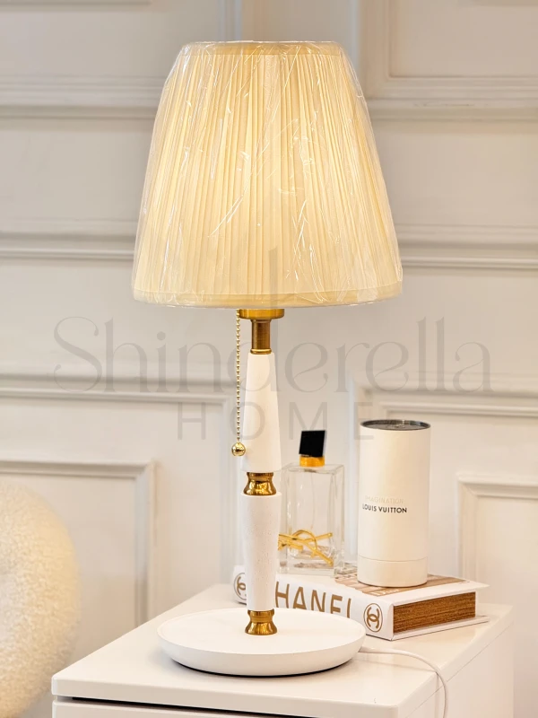 تيبل لامب ابيض وذهبي مخطط مع طربوش ايفوري